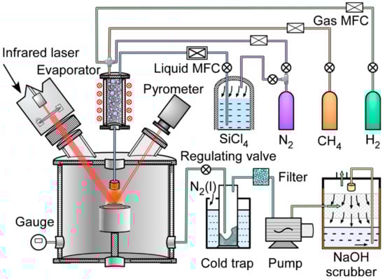 - Lai, Y.F.; Cheng, H. Fine-grained 3C-SiC thick films prepared via hybrid laser chemical vapor deposition. J. Am. Ceram. Soc. 2019, 102, 1–11. [Google Scholar] [CrossRef]