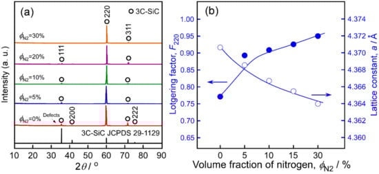 Figure 2a shows typical XRD patterns of the 3C-SiC bulks prepared by HLCVD with ϕN2 values up to 30%. No traces of second phases were detected in the XRD patterns. A small shoulder observed at 2θ ~ 33.8° could be attributed to planar defects [20,21,22]. All specimens deposited at Tdep = 1623 K and Ptot = 4 kPa exhibited a <110> preferred orientation. Figure 2b shows the Lotgering factors (Fhkl) and lattice constants (a) of the N-doped 3C-SiC samples. Fhkl was calculated from Equation (1) [23]: