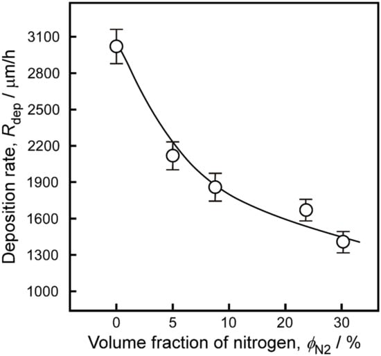 Figure 3 displays the surface (a–e) and cross-sectional (f–j) morphologies of 3C-SiC bulks prepared with various ϕN2 values. The undoped 3C-SiC bulk sample shows a cauliflower-like surface structure (Figure 3a) and a columnar cross section (Figure 3f). The cross-sectional morphology of the N-doped 3C-SiC samples are still columnar (Figure 3g–j), while the surface morphology (Figure 3b–e) changed with increasing ϕN2. The aggregate particle size decreased from approximately 250 μm (undoped sample) to 60 μm (ϕN2 = 30%), and the morphology gradually changed from cauliflower to fourfold-symmetric pyramid microstructure. The pyramidal grains were considered to be the final stage of the twin-plane propagation model previously proposed for fully <110>-oriented 3C-SiC [26]. The change of morphology indicates the enhancement of <110>-orientation. However, it is not a complete pyramid structure in Figure 3e, indicating that 3C-SiC is still not completely <110>-oriented when nitrogen volume fraction reaches 30%, which is consistent with the XRD results. Figure 4 shows the dependence of the deposition rate on ϕN2. The Rdep values were calculated from the deposition time and film thickness. With increasing ϕN2, Rdep decreased from 3000 μm/h for the undoped sample to 1437 μm/h at ϕN2 = 30%. As the substitution of N atoms mostly occurs at the C sites in the SiC lattice, the dopant may occupy the surface sites of the carbon-containing group, leading to a decrease in the deposition rate [27].