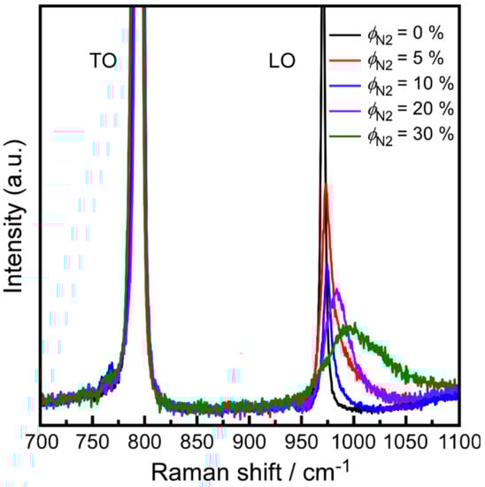 Figure 5 shows the Raman scattering spectra of N-doped 3C-SiC bulks deposited at Tdep = 1623 K with different ϕN2 values. The characteristic Raman modes of pure 3C-SiC primarily consisted of transverse optical (TO) and longitudinal optical (LO) phonons at 796 and 972 cm−1, respectively [28]. This is consistent with the Raman characteristics of the undoped 3C-SiC bulk. However, for ϕN2 > 5%, the shape of the LO peak of the 3C-SiC bulks showed a marked change, due to Raman scattering from LO phonon-plasmon coupled (LOPC) modes. In a polar semiconductor, the free carrier plasma interacts with the LO lattice vibrations (phonons) via macroscopic electric fields. As a result of this interaction, instead of a pure plasmon and a pure LO phonon, a coupled plasmon-phonon mode appears in the spectrum [29,30]. Yugami et al. studied the appearance of the TO and LO peaks in N-doped 3C-SiC, and suggested that the increase in carrier concentration due to the incorporation of N was closely related to the LO peak. The LO peak shifted toward high frequencies and became broader with the decrease in peak intensity as the carrier concentration increased. In contrast, the frequency and full width at half maximum (FWHM) of the TO peaks did not change with the carrier concentration [31]. In this study, the frequency of the LO peak gradually shifted from 972 cm−1 to higher frequencies with increasing ϕN2. In particular, the frequency of the LO peak reached 997 cm−1 for ϕN2 = 30%.