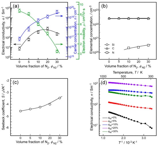 Effect of ϕN2 on electrical conductivity, carrier concentration, and mobility (a), elemental compositions (b), and Seebeck coefficient (c) of N-doped 3C-SiC bulks. (d) Temperature dependence of electrical conductivities of N-doped 3C-SiC bulks.