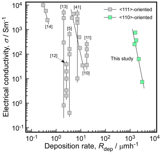 Figure 8 compares the electrical conductivity and deposition rate of the N-doped 3C-SiC samples prepared in this study with those reported in the literature [5,10,11,12,13,14,41]. Since most previous studies only provide approximate deposition rates, we assume that they involve a constant deposition rate. Most doped 3C-SiC samples were prepared via conventional CVD using NH3 as dopant, and exhibited <111> but not <110> orientation. The electrical conductivities varied between 33 and 1 × 104 Sm−1 while the deposition rates were in the 0.4–18 μmh−1 range. The N-doped 3C-SiC bulks prepared via HLCVD in this study exhibited predominant <110> orientation, high deposition rates (1430 to 1670 μmh−1, between 80 and 4000 times higher than those reported in the literature), and high electrical conductivities (7.4 × 102 Sm−1).