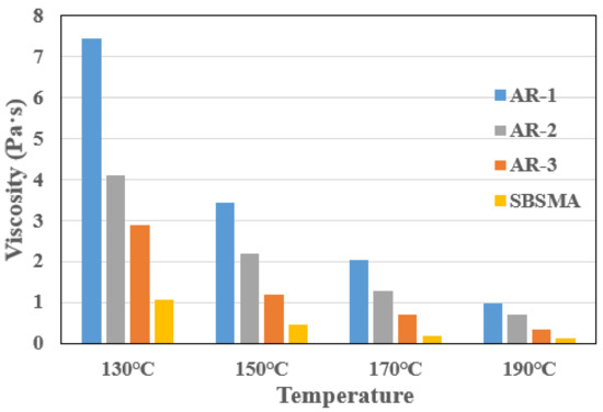 The viscosity of binders could not be too high during mixing and compacting processes, because higher viscosity means more energy needed to heat and obtain enough mobility and workability of the binder. So, to reduce the viscosity of AR, the microwave desulphurization process was adopted. The results of viscosity changing with temperature are presented in Figure 2.