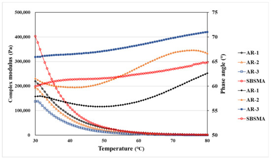 The viscoelastic property of asphalt binders, including AR, vary greatly with temperature and is the main characteristic of rheology. The temperature sweep test was employed to measure the viscoelastic property from 30–80 °C. Complex modulus is an indicator of the stiffness and elastic component of materials. Occurring at high temperatures, the main challenge facing asphalt pavement is rutting, so a higher complex modulus is preferred due to its better anti-deformation performance. Conversely, the phase angle could indicate the viscous component of the materials, and a high phase angle (high viscous component) may indicate a poor anti-deformation. The rutting factor (G*/sinδ) combines the complex modulus and phase angle to evaluate the property of anti-rutting versus temperature. The data, including complex modulus, phase angle and rutting factor, are shown in Figure 3 and the high temperature PG grade of all samples is summarized in Table 6.
