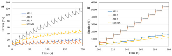 Beyond the indicator of G*/sinδ, to investigate the resistance to permanent deformation at high temperature further, the MSCR was used. The anti-deformation properties depend on two factors: the stiffness, which decides the initial strain, and the strain recovery ability, which decides how much strain could be recovered and what final deformation could be left. The time–strain response of all samples curing the MSCR test are summarized in Figure 4, and the recoverable rate (R) and non-recoverable compliance (Jnr) are shown in Table 7.