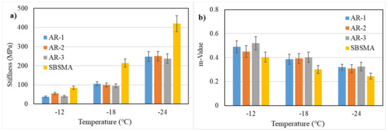 Generally, the low-temperature performance of binders indicates anti-cracking properties, meanwhile the ductility at 5 °C cannot well reflect the low-temperature performance of AR binders because the particle effect of CR in AR binders cannot be ignored as it could have an effect of decreasing the ductility values. BBR was used to measure the low-performance of AR binders. The stiffness and m-value were thought to be well related to the low-performance of asphalt: the lesser stiffness and the bigger the m-value is, the better anti-cracking properties the asphalt binders have. The results of stiffness and m-value are summarized in Figure 5.