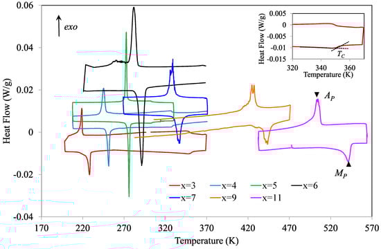 Differential scanning calorimetry (DSC) curves obtained during cooling/heating cycles for the complete set of studied alloys. The characteristic temperatures, MP for the forward and Ap for the reverse martensitic transformations (MTs), are also indicated. The inset shows the determination of the Curie temperature of austenite, TCA, for the alloy with x = 3.