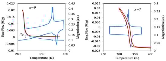 For alloys with Cu content less than 6, DSC curves show, in the austenite temperature range, an inflection that can be clearly attributed to the ferromagnetic transition of the parent phase; an example is shown in the inset of Figure 1 for x = 3, where the determination of the Curie temperature of austenite, TCA, is also indicated. For the other alloys, such an inflection is not observed, but the magnetic transition can be evidenced by thermogravimetric measurements under a permanent magnet. Examples are shown in Figure 2 for alloys with x = 7 and x = 9. However, while for x = 9, a non-hysteretic magnetization increase is observed in the martensitic region—thus corresponding to the ferromagnetic transition in martensite at the corresponding Curie temperature, TCm—for x = 7, the magnetization increase occurs simultaneously with the MT and shows the temperature hysteresis that is characteristic of this first order transition. It can be also seen in Figure 1 that, for x = 6, a second exothermic event is observed upon cooling below the main peak, which corresponds to an intermartensitic transformation (IMT), as will be discussed later.