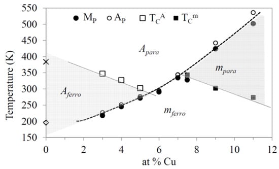 Figure 3 shows all the transition temperatures as a function of x. The result is a phase diagram where the regions corresponding to different crystallographic and magnetic states of the alloys can be distinguished, similar to that obtained in []. Particularly, the domain where the magnetostructural transition Apara⟶mferro can occur is restricted to x = 5.5–7.5.