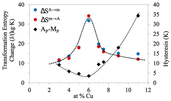 Absolute values of the transformation entropy changes, for the forward and reverse MTs, together with the thermal hysteresis computed as ΔT = AP − MP, as a function of Cu content.