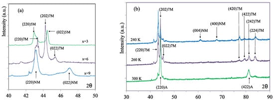 (a) Representative portion of the X-ray diffraction (XRD) patterns of the martensite structures for x = 3, x = 6, and x = 9; (b) XRD patterns obtained at different temperatures for x = 6, corresponding to the structures of austenite, 7M, and NM martensites.