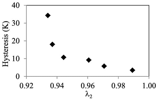 The lattice parameters of the identified structures are given in Table 3, together with the tetragonality (c/a) and the computed middle eigenvalue (λ2). The relationship between thermal hysteresis and λ2 is shown in Figure 6, where excellent correlation can be observed. Indeed, the lowest λ2 is obtained for x = 6, pointing to the lattice compatibility as the main cause of the low hysteresis displayed by this alloy. Even so, this issue should be studied more deeply, with additional experiments that allow to analyze in more detail the relationship between crystallographic compatibility and hysteresis and also to assess the role of magnetism.