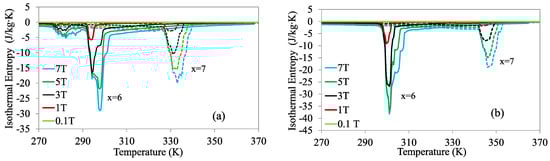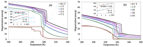 The M(T) curves recorded under different magnetic fields up to 7 T are shown in Figure 7 for alloys with x = 6 (a) and x = 7 (b), both within the window in which the magnetostructural Apara→mferro transformation occurs. As expected for the positive magnetization jump upon forward MT, the transformation temperatures rise with the increasing applied field, as shown in the insets of Figure 7. The magnetization jumps stabilize above 3 T, at about 28 emu/g for x = 6 and 18 emu/g for x = 7, and consequently with the decrease in saturation magnetization observed for the increasing Cu content []. These data, combined in Equation (1) with the entropy values quoted above, lead to (dT/dH) rates of 0.8 K/T and 0.9 K/T for x = 6 and x = 7, respectively, which do not differ much from those obtained experimentally, 1.0 K/T and 1.1 K/T, as shown in the insets of Figure 7.