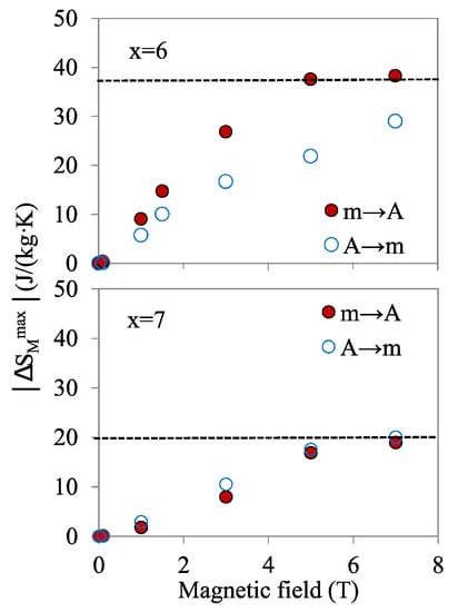 The maximum absolute values of the magnetocaloric entropy change, , for alloys x = 6 and x = 7 are presented in Figure 9 as a function of magnetic field. For the m→A transition of the x = 6 alloy, saturates for high fields, at a value slightly higher than the zero-field transformation entropy change |∆S| ≈ 36 J/(kg·K) (the difference can be attributed to the increase of |∆S| with applied field []). For the forward transition, A→m, the occurrence of IMT limits the maximum values, although it extends the temperature range for the MCE. In the case of the x = 7 alloy, tendency to saturation is also observed, at a value of , close again to the zero-field transformation entropy change for this alloy, |∆S| ≈ 20 J/(kg·K).