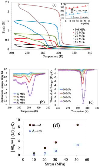 where ε is the strain, σ is the applied stress, and ρ is the density of the alloy, which was estimated as 8.32 g/cm3 from the XRD results. The temperature dependence of ΔSE for loads up to 50 MPa is shown in Figure 10b,c. defined analogously to MCE, is given as a function of applied stress in Figure 10d.