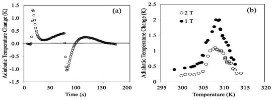 To assess the real potential for caloric cooling, direct measures of adiabatic temperature change (ΔTad) were addressed in the x = 6 composition, closer to the real conditions used in applications than the indirect calculation of isothermal entropy change through Maxwell’s relationships. Although the measurements are currently in progress, by way of example, some results are shown. Figure 11a shows the adiabatic temperature changes measured during compressive loading and unloading up to 100 MPa at a strain rate . The measurement was performed using a thermocouple attached to a rectangular cuboid-shaped sample at a temperature of T = 310 K. On its turn, Figure 11b shows the temperature dependence of the adiabatic temperature change obtained by direct measurements in a magnetic field up to 1 and 2 T. These measurements were made in an own-built set up specially designed for this purpose (see the work of [] for details).