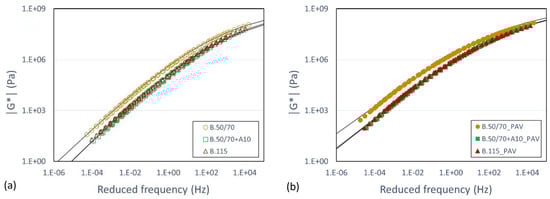 Furthermore, Figure 1 shows the master curves of the complex shear modulus norm at a reference temperature of 30 °C in order to have a comprehensive picture of the rheological response of three investigated binder in both unaged and aged conditions. The experimental data were gathered by performing frequency sweeps at different temperatures by means of DSR. The modified Christensen-Anderson-Marasteanu (CAM) model [] was adopted to relate and the testing frequency, by applying shift factors based on the Williams–Landel–Ferry law [].