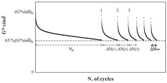 Each loading phase stopped when the dropped down to 65% of its initial value (i.e., 35% loss modulus reduction which represents the selected damage level) and started again after 30 minutes. During each rest period, the stiffness recovery of the material was also monitored by applying a very low strain equal to 0.01% in order to avoid material damage. Typical healing test results are shown in Figure 2 in terms of 35% loss modulus reduction per each loading phase. The main parameters able to quantify the overall fatigue endurance limit of each binder, according to the selected modeling approach [], can be summarized as follows: