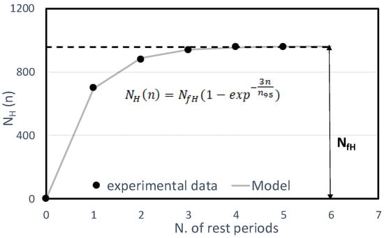 where NH is the overall self-healing contribution after “n” rest periods, ∆Ni is the number of loading cycles after each “i-th” rest period, which are necessary to reach the same damage level selected (65%), ΔNH(i) is the self-healing contribution (variable depending on the “i-th” rest-period considered), and is the thixotropy contribution (constant for each rest/load phase). In particular, the self-healing contribution ΔNH(i) decreases with the amount of rest applied and vanishes after a certain number of rest periods. Thus, after a high number of rest periods (virtually infinite) the cumulative self-healing contribution, defined as the self-healing potential, converges to a finite value NfH as depicted in Figure 3. Finally, the healing index (HI) can be calculated as follows: