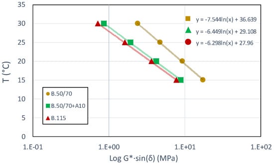 Figure 4 shows the typical results of the isochrone tests carried on unaged binder. In particular, values of were plotted in a semi-logarithmic scale as function of test temperature and a linear regression was run to fit experimental data with the aim to identify the temperature dependency of stiffness. Finally, it is possible to back calculate the temperature required to guarantee the desired target stiffness from the linear fitting.