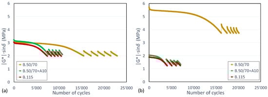 From the analysis of both plots, it can be seen that the damage accumulation is similar between bio-binder and bitumen B.115 and it is faster than in the binder characterized by a lower penetration grade, regardless of the applied rest periods. This finding is consistent with previous studies confirming that for a not-significant level of strain, harder bitumens have a better fatigue response than softer ones [].