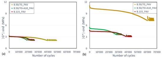 Figure 6 shows that similar trends were obtained for aged binders as well. This result is consistent with those reported in Figure 5, highlighting that a binder characterized by a higher consistency shows enhanced fatigue behavior compared to a softer binder.