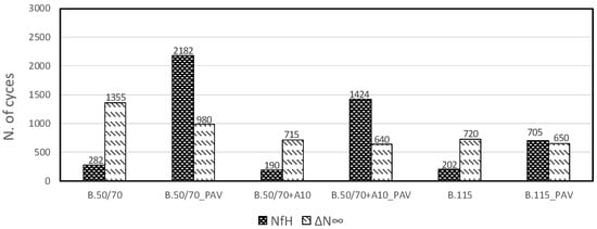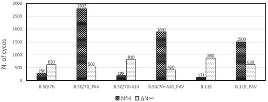 Table 5 and Table 6 also report the values of parameter n95 that is the number of rest periods necessary to reach the 95% of the asymptotical value NfH (Figure 3), in other words after this number of the rest period the material has almost achieved its complete healing potential. The values of n95 seem to be mainly affected by the aging conditions rather than by the binder type. In particular, the n95 values are higher for the aged binders, denoting that the aged binders are more prone to preserve the self-healing capability for a higher number of rest period.