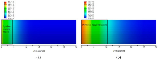 Figure 8 shows the decomposition degree contours of the glass fiber phenolic resin composite, which equals one minus F, which is defined in Equation (4). In fact, decomposition degree is the expression of dimensionless treatment of density, which is usually used for relative research [29,47,48]. Namely, the decomposition degree of 0 represents the fact that the material density is the virgin density, and the decomposition degree of 1 represents that the material density is the char density. At 50 s, the material close to the heated surface has not completely decomposed, and the range in the pyrolysis region was 4.50 mm. With increasing heating time, the char region began to appear. The range of the char region were 3.56 mm and 6.49 mm, at 200 s, and 400 s, respectively, while the range of region where the pyrolysis reaction was undergoing were 6.94 mm and 9.16 mm, respectively. At 800 s, the range of the material char region and the pyrolysis region were 10.97 mm and 14.03 mm, respectively. It is noted that the char region and the pyrolysis region enlarged further with increasing time. This may be due to the increasing thermal conductivity caused by the temperature increase, resulting in the heat transfer being faster. Thus, the char region and pyrolysis region can be distinguished definitely, which is an appropriate metric for predicting the likelihood of cracking or delamination caused by decomposition, for helping to evaluate the thermal behavior of composites [30].