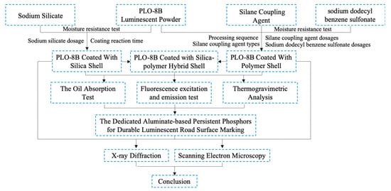 In this paper, SrAl2O4: Eu2+, Dy3+ persistent phosphors were subject to the silica shell coating, polymer shell coating, and the silica–polymer hybrid shell coating. Coating properties were evaluated based on the moisture resistance, organic compatibility, thermal stability, luminosity, and microstructure characterization to explore the optimum composition as shown in Figure 1. The objective of this study was to prepare the dedicated aluminate-based persistent phosphors considering the integrated pavement environment, as the first step to achieve the durable luminescent road surface marking. The simultaneous use of inorganic and organic coating combines their advantages on the moisture resistance and organic compatibility to achieve the balanced design. The moisture resistance and thermal stability of SrAl2O4: Eu2+, Dy3+ persistent phosphors were comprehensively evaluated based on the integrated pavement environment for the first time.
