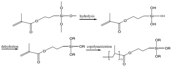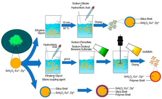 Literatures suggested the pretreatment with transparent and well-compatibility silane coupling agent is necessary for persistent phosphors to enhance the modification effect of the organic coating []. Due to the alkoxy functional groups of the silane coupling agent produce highly active hydroxyl functional groups after hydrolysis reaction, the first shell was formed on the surface of persistent phosphors. After the pretreatment, the persistent phosphors with a silicon dioxide shell was then coated with the polymer shell from the polymerization reactions of acrylic acid monomer (AA) and methyl methacrylate (MMA) by sol-gel method to achieve the graft modification of the polymer shell as shown in Figure 3 [].