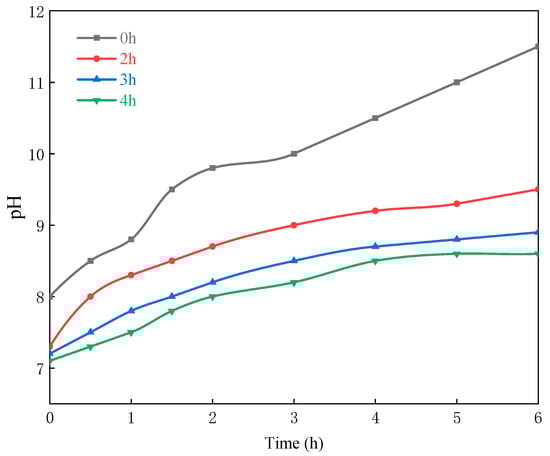 As showed in the Reaction (2), SrAl2O4: Eu2+, Dy3+ persistent phosphors are destroyed with water, which contributes to the degradation of their luminescent property and the increase of solution pH []. Due to the longest average rainfall duration in China being 5.4 hours based on the Chinese meteorological statistics [,], pH of the solution after 6 hours was selected to evaluate the moisture resistance. In the test, 0.5 g of luminescent powder was soaked in 40 °C water. The change of pH with time was measured using a digital pH test pen. The growth rate of solution pH (PR) soaked with PLO-8B luminescent powder coated with different shells was calculated to evaluate the improvement of moisture resistance by the following Equation: