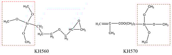 Molecular structures of different silane coupling agents are shown in Figure 8. Siloxy groups forming the highly active silanol after the hydrolysis reaction are observed both in the KH560 and KH570, which bonds with the hydroxyl groups on the surface of persistent phosphors and undergo polycondensation by the “Si–OH” functional group. However, the methacrylic group in KH570 is unique. It is copolymerized with MMA and sodium persulfate to generate a denser polymer shell further improving the moisture resistance.