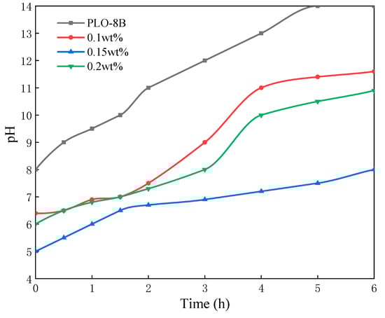 The surfactant (sodium dodecyl benzene sulfonate) dosage determines the conversion rate of the methacrylic monomer, relating to the quality of the polymer shell. Three samples of polymer shell coating (sodium dodecyl benzene sulfonate dosages are 0.1, 0.15, 0.2 wt%, respectively) were prepared to select the optimum surfactant dosage. As Figure 10 shows, the solution pH started significantly increasing from 1.5 h, indicating the polymer shell had been severely damaged. Obviously, the moisture resistance of the polymer shell coating samples with 0.1 or 0.2 wt% surfactant was much worse than 0.15 wt%. Too much surfactant (0.2 wt%) leads to the violent polymerization reaction. The newly grown polymer shell rapidly aggregates on the surface of PLO-8B luminescent powder, resulting in the loose structure of the polymer shell. On the contrary, too less surfactant (0.1 wt%) limits the formation of polymer shell. Thus, 0.15 wt% is selected as the optimum surfactant dosage.