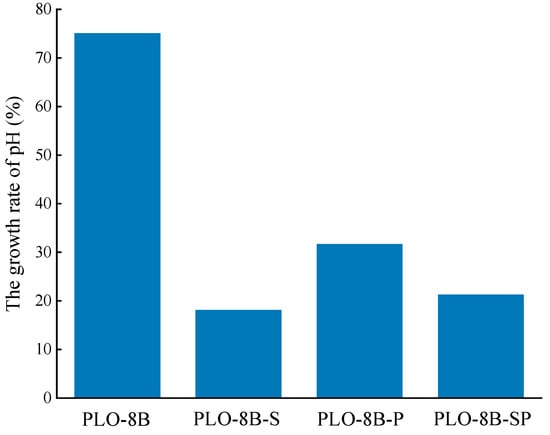 PLO-8B luminescent powder coated with silica–polymer hybrid shell (PLO-8B-SP) was prepared to compare the moisture resistance with PLO-8B luminescent powder coated with silica shell (PLO-8B-S) and polymer shell (PLO-8B-P). As Figure 11 shows, the silica–polymer hybrid shell coating significantly slowed down the increase of solution pH, indicating the improvement in the moisture resistance. The growth rate of solution pH soaked with PLO-8B, PLO-8B-S, PLO-8B-P, and PLO-8B-SP was 75%, 18%, 32%, and 21%, respectively as shown in Figure 12. The PLO-8B-S and PLO-8B-P was prepared based the on the optimal composition from the previous tests. Obviously, all types of shell coating significantly improve the moisture resistance of PLO-8B luminescent powder. The growth rate of solution pH soaked with PLO-8B-S, PLO-8B-P, and PLO-8B-SP was decreased by 75.93%, 57.89%, and 71.72%, respectively compared to PLO-8B. The moisture resistance of PLO-8B luminescent powder coated with silica–polymer hybrid shell was significantly improved compared to polymer shell coating, indicating the silica shell coating contributes the most in the test.