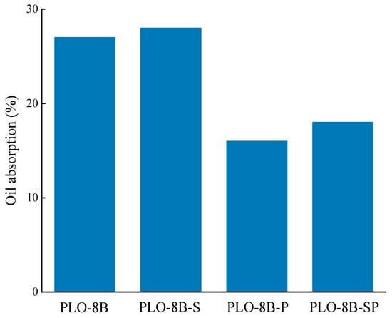 The oil absorption of persistent phosphors shows the organic compatibility, indicating the compatibility with other organic solutions in waterborne coatings such as auxiliaries and binders [,,]. Four samples were prepared to evaluate the organic compatibility based on the oil absorption test according to the ISO787-5-1980 as shown in Figure 13. The organic compatibility of PLO-8B-S, PLO-8B-P, and PLO-8B-SP was improved by 7.41%, 40.74%, and 33.33%, respectively indicating the silica shell coating has little effect on the oil absorption. Both the polymer shell coating and the silica–polymer hybrid shell coating greatly improved the organic compatibility of PLO-8B luminescent powder. Due to the decrease in silane coupling agent and AA/MMA dosage, the organic compatibility improvement of PLO-8B luminescent powder coated with silica–polymer hybrid shell is slightly weaker than that of PLO-8B luminescent powder coated with polymer shell.