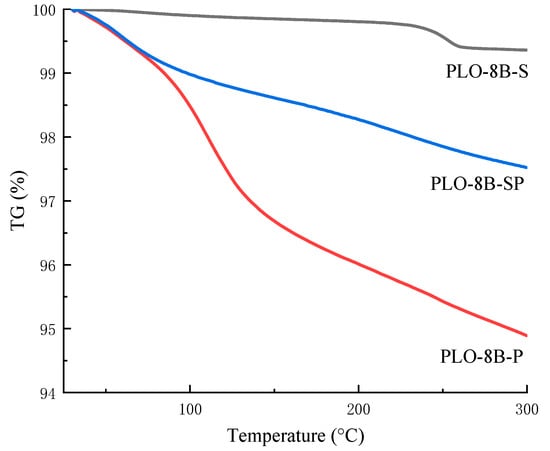 The comprehensive thermogravimetric analyzer (TGA/DSC 3+, METTLER TOLEDO) was used to measure the TG curves of PLO-8B luminescent powder coated with silica shell, polymer shell, and silica–polymer hybrid shell as shown in Figure 14. PLO-8B-P constantly lost mass with the temperature increasing due to the volatilization of polymer shell. The mass loss of PlO-8B-S was within 0.5%, indicating the better thermal stability. The initial thermal weight loss behavior of PLO-8B-SP was consistent with PLO-8B-P, due to the same polymer shell. However, the less silane coupling agent and AA/MMA dosage formed the thinner polymer shell coating the PLO-8B luminescent powder in PLO-8B-SP. Thus, the thermal weight loss of PLO-8B-SP slowed down gradually. Obvious, the easily decomposable polymer shell coating is not suitable to prepare the dedicated aluminate-based persistent phosphors for the durable luminescent road surface marking, due to the extremely high temperatures of pavement surface in some cases. The silica and silica–polymer hybrid shell contributed to the better thermal stability of PLO-8B-S and PLO-8B-SP, indicating the ability to ensure the moisture resistance in the wider range of temperature.