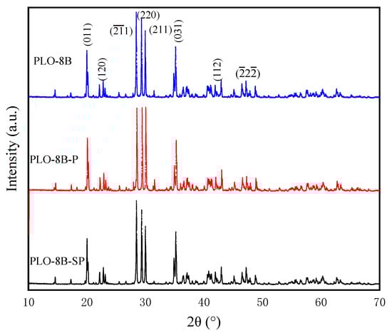 XRD patterns of PLO-8B luminescent powder (PLO-8B), PLO-8B luminescent powder coated with polymer shell (PLO-8B-P), and PLO-8B luminescent powder coated with silica–polymer hybrid shell (PLO-8B-SP) [].