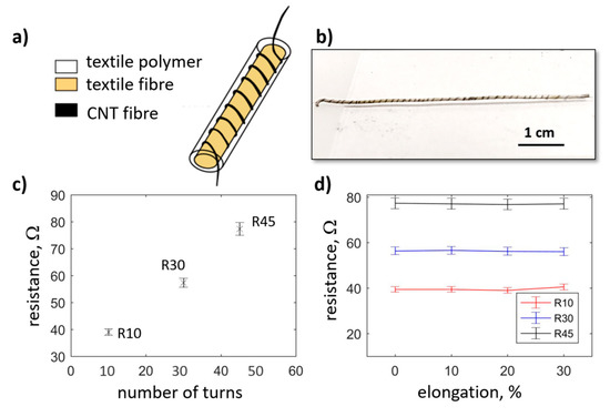 Firstly, spun CNT fibers and films may be used in their pure form. Examples of these applications include strain sensors, simple wiring, heaters and electrodes [38,39,40,41,42]. Figure 2 presents an example of a resistor that uses a single filament fiber twisted around an elastodiene core, which ensures the high elasticity of the resistor. The use of a single filament fiber guarantees high resistance which increases linearly with the number of turns, where each turn should be treated as a unit length of the resistive filament (Figure 2c). It can be seen in Figure 2d that the resistance does not change as a wide range of strains are applied to the core. The whole structure is coated with an elastomeric polymer to stop the fiber from moving and to provide electrical insulation.