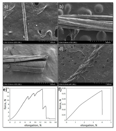 Finally, it is also important to mention that the formation of the macroscopic structure for specific applications may also have an impact on the performance of the prepared element. For example, by their nature, aligned spun films and fibers have a much better conductivity along the axial direction than the orthogonal one due to the extreme anisotropy of electrical properties of individual CNTs (CNTs show high conductivity only along their long axis) [51]. The stacking of films may be performed in a unidirectional or bidirectional manner and this affects the anisotropy of the conductivity and electric current distribution in the structure [22]. Another example concerns single filament fibers and fibers of larger diameters. It may be shown that the rolled and braided fibers have a significantly higher elasticity than single filaments. The latter ones break abruptly at approximately 3–4% elongation only (Figure 3f), while the braided and rolled fibers may break at a figure of 10% elongation or more (Figure 3e). In the latter case the failure is often stepped, which stems from the greater structural unevenness of large diameter fibers. These fibers possess many load-bearing filaments that may have differing strengths and therefore are not stressed simultaneously.