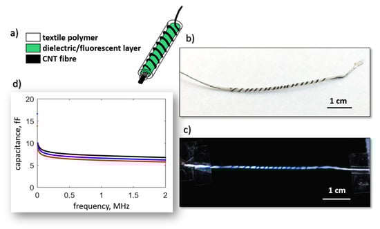 Finally, the coating may also be used to change the functionality of the fibers [31,66]. The example presented in Figure 4b show a schematic and photograph of a luminescent yarn formed by coating a base fiber with dielectric paste mixed with luminescent powder and the twisting of second CNT fiber electrode on the top of the first one. The capacitor is formed in such a way glows when powered with 1 kHz at 90Vp-p (Figure 4c) and shows very uniform electrical performance. Figure 4d presents the capacitance of three similar 4-cm-long samples. Importantly, the luminescent fibers remain highly flexible, and may be sewn into any textile.