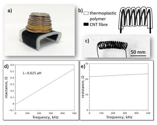 Figure 5a presents an example of a CNT film hot-pressed between thick, low-density polyethene sheets which are then further thermoformed into a sturdy table-like structure. Another example is shown in Figure 5b,c. Figure 5b presents a coil made by the thermoforming of polymer-coated CNT fibers while Figure 5c shows a coil manufactured form a CNT fiber coated with Nylon 6. Figure 5d,e show the performance of the coil with 10 turns, 1 mm in diameter made of the fiber, presented in Figure 3b and coated with Nylon insulation of approximately 50 μm thickness. It can be seen that the resistance is satisfactorily stable upon increasing the frequency. The inductance amounts to approx. 0.625 μH.