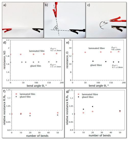 Measurement of the resistance change upon the bending of the flexible component. (a) Initial resistance measurement (performed before bending). (b) Measurement of the bend angle and (c) diameter of the 180° bend. (d) Changes of the resistance upon bending of the thin film electrode and (e) fiber electrodes presented in Figure 6. (f) Changes in the resistance of the thin film electrode and (g) the fiber electrode presented in Figure 6, bent repetitively at 180°. These changes are presented as values relative to the initial resistance R0, recorded after the first test presented in Figure 7f,g.