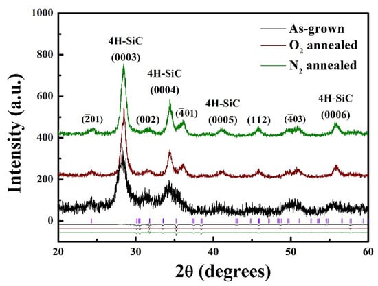To compare the influence of different annealing atmospheres on the crystallinity of Ga2O3 deposited on the 4H-SiC substrates, X-ray diffraction (XRD) θ–2θ scans were performed on the as-grown, O2 and N2–annealed samples. As shown in Figure 2, all the sample sets show reflections corresponding to polycrystalline Ga2O3 with a monoclinic structure from Rietveld refinement by using General Structure Analysis System (GSAS) [18,19]. All the manufactured samples give β-Ga2O3 diffraction peaks corresponding to (−201), (−401), and (002) faces. The crystal structures remained stable. In fact, the peak intensities were further enhanced after annealing. In particular, the peak intensities corresponding to the (−201) and (−401) faces significantly increased after N2 annealing. As explained in the literature, Ga and O atoms migrate under high-temperature annealing and thus help improve the crystallinity of Ga2O3. Furthermore, dangling bonds related to oxygen defects at grain boundaries can be passivated by N2 annealing by incorporating nitrogen atoms at gallium or oxygen lattice sites [20,21]. Consequently, the diffraction peak intensities of the N2-annealed samples are higher than those of the other samples, as nitrogen appears to improve the crystal quality of the Ga2O3 [22,23].