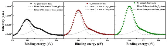 Figure 4 shows the XPS spectra of the O 1s peaks of the three different sample sets. The peaks were calibrated using C 1s at 284.6 eV, in which the O 1s peaks were fitted using two Gaussian peaks, corresponding to Ga2O3 and GaOx phases, respectively. After annealing in O2 and N2 atmosphere, the peak intensity of the GaOx phase decreases, whereas that of the Ga2O3 phase increases. The GaOx peak is reported to have a connection with oxygen vacancies [26]. The magnitude of the peak intensity corresponding to the GaOx phase was reduced, from 37.5% for the as-grown sample to 20.3% and 13.6% for the O2 and N2-annealed samples, respectively. This is considered to indicate a decrease in the number of defects, such as oxygen vacancies and oxygen sites. The atomic ratios of O to Ga in the samples are 1.40, 1.43 and 1.42 for as-grown, O2 and N2 annealed Ga2O3. These different stoichiometric ratios indicate that an increased concentration of O2 in the annealing gas can somewhat raise the number of oxygen atoms in the films.