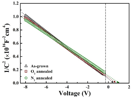 The extracted values of Vbi and doping concentration of the Ga2O3 thin films are 0.47, 0.86, and 1.01 V and 9.59 × 1015, 1.62 × 1016, and 2.01 × 1016 cm−3 for the as-grown, O2-annealed, and N2-annealed samples, respectively. The Vbi and doping concentration values increased after annealing, because of the decrease in oxygen-related traps. The increase in the built-in voltage can be attributed to the changes in the dopant concentration and the concentration of interface states of Ga2O3.