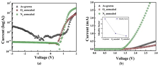 Here, I and V are the forward current and voltage, respectively, I0 is the saturation current, kB is Boltzmann’s constant, T is the absolute temperature, and η is the ideality factor. The ideality factor is significantly reduced after the annealing process; the ideality factor of the N2-annealed diode is 2.8, which is half that of the O2-annealed diode. The lower ideality factor and the higher built-in voltage of the annealed diodes are attributed to the improved crystallinity and interface properties.