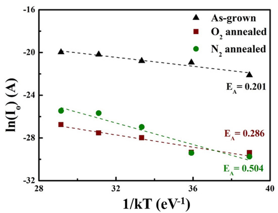 The thermal activation energy (EA) is obtained from the ln (IO)–1/kT plot shown in Figure 7. The graph was plotted in the temperature range of 298–523 K with a temperature step of 25 K, where IO is the reverse saturation current at −3 V, and T and k are the absolute temperature and Boltzmann’s constant, respectively. The extracted activation energy from the experimental measurements are related to trap states at the metal–Ga2O3 interfaces and the barrier heights. Low activation energy values suggest a high concentration of the trap states at the interface, which results in increased trap-assisted tunneling or thermionic emission probabilities across the barrier. As shown in Figure 6, the extracted activation energy of the devices increases after annealing. In particular, the activation energy of the N2-annealed sample (0.504 eV) is twice that of the as-grown sample. The improved rectifying ratio of the N2-annealed diode is also attributed to the increased activation energy.