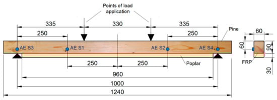 The retrofitting and repairing of timber structures is a topic of growing interest, mainly in the case of structures with historical interest, or in those cases where replacing existing structural elements by new ones is extremely expensive and time consuming. Many of the existing wooden structures are made of pine, being the Pinus Sylvester widely used in many areas of the Iberian Peninsula. For several decades, many works have demonstrated the enormous advantages of FRP (fiber reinforced polymer) composite materials for retrofitting and repairing of structural elements (mainly beams) of concrete or timber, whether embedded in the structural element by means of artificially grooves (near-surface mounted technique), or externally applied (usually on the tension face but also on lateral sides of the element for shear reinforcement) [,,,,,,,,,,,,,,,].