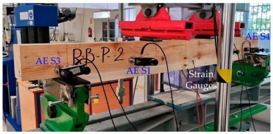 All the four samples were subjected to a four-point bending test, as shown in Figure 1 and described in []. The strains at the mid cross-section were measured by gluing six strain gauges as explained in []. In order to obtain the MOEst (static modulus of elasticity), the stress-strain slope, with the strain gauge placed on the tension face of the poplar plank, was calculated between 20% and 50% of the maximum stress. Four multiresonant VS45-H piezoelectric sensors (AE sensors, Vallen Systeme, Icking, Germany) were mounted on each specimen, as indicated in Figure 1 []. They were acoustically coupled to the specimens by means of silicone grease, and using magnetic holders hooked to flat washers, which were in turn previously glued on the wood surface. The acquisition threshold was 25 dB and the gain 34 dB. The AE signals were acquired with five Msamples/s, a 50 kHz high pass filter, and a 500 low pass filter. Moreover, in order to avoid friction noise, thin Teflon pieces were placed between the wood specimen and the supports. Figure 2 depicts a particular specimen at the testing machine. For each recorded signal, the peak amplitude in dB (A) and the signal strength (SS) were obtained. Moreover, using the hits received for each sensor, a linear location of the AE events was carried out, and 300 cm/ms was used as propagation speed of the specimen along the longitudinal direction (grain direction).
