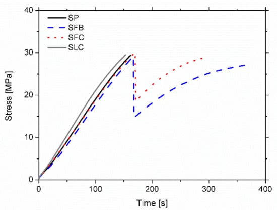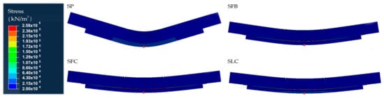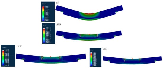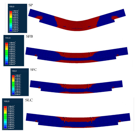 Figure 5 shows the plasticization pattern, demonstrating the previous stress/strain differences between the specimens retrofitted with FRP elements and the SP specimen, as well as the stiffness variations of the different FRP materials. In particular, it can be noticed that the SP specimen reaches the highest plasticization level between the four specimens, with all the mid-part of the specimen plasticized. On the other hand, the SLC specimen is the least plasticized due to the higher stiffness of the CFRP laminate. SFB and SFC ones show a similar behavior.